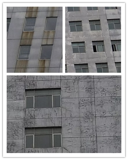 案例:該墻面大面積龜裂,涂膜粉化,脫落,霉斑,污漬明顯。